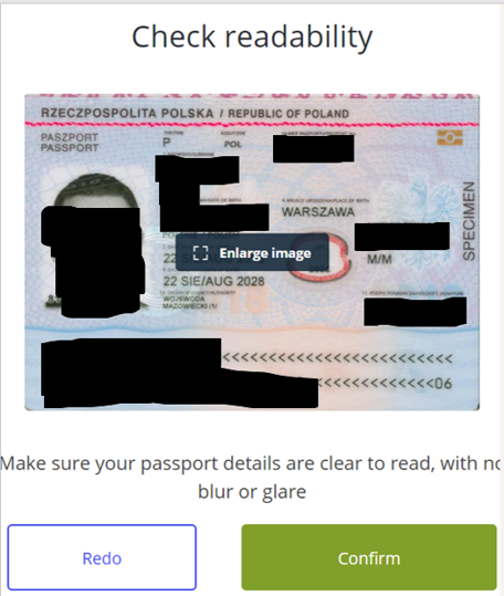 To verify that this is your passport, you need to take a picture of yourself. Follow the instructions on your mobile phone and make sure that the picture is clear before confirming.